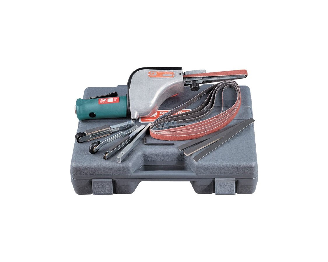 Per smerigliatura, sbavatura, mascheratura e lucidatura su metallo, plastica fibra di vetro, materiali compositi, gomma, vetro ed altro ancora. Kit composto da: utensile Dynafile 1400, 5 bracci di contatto, assortimento di nastri abrasivi, comoda val